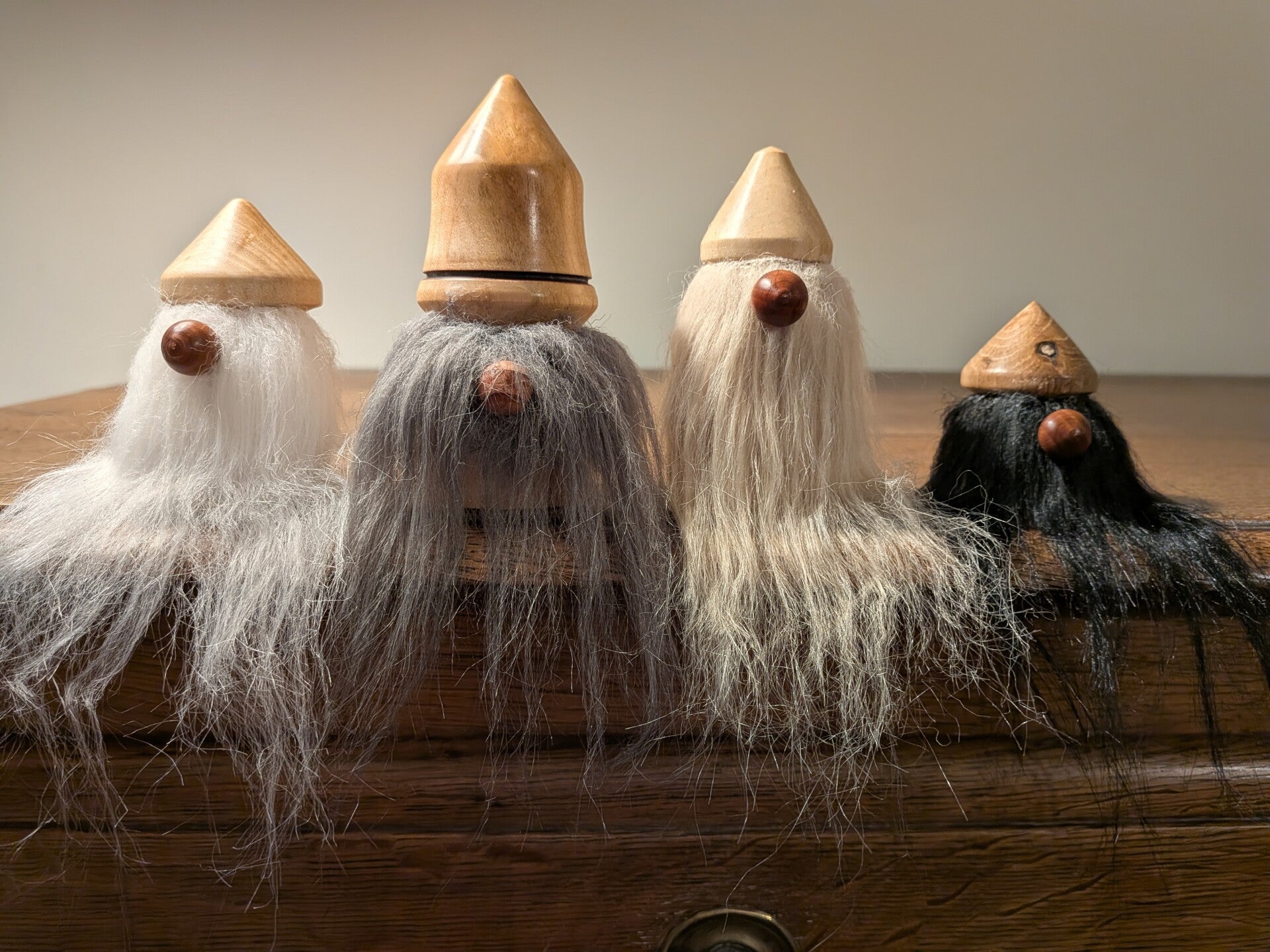 Lutin nez rouge (en sequoia) en loupe de merisier (1), d'if (3), en pistachier (5)